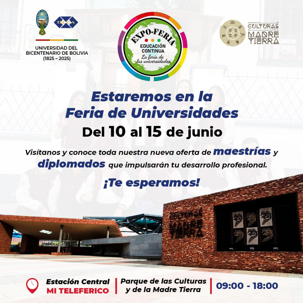 ¡Estamos en la Feria de Universidades y tú no puedes faltar! Del 10 al 15 de junio, acompáñanos en el Parque de las Culturas y de la Madre Tierra (Estación Central - Mi Teleférico) de 09:00 a 18:00 hrs. Informaremos…