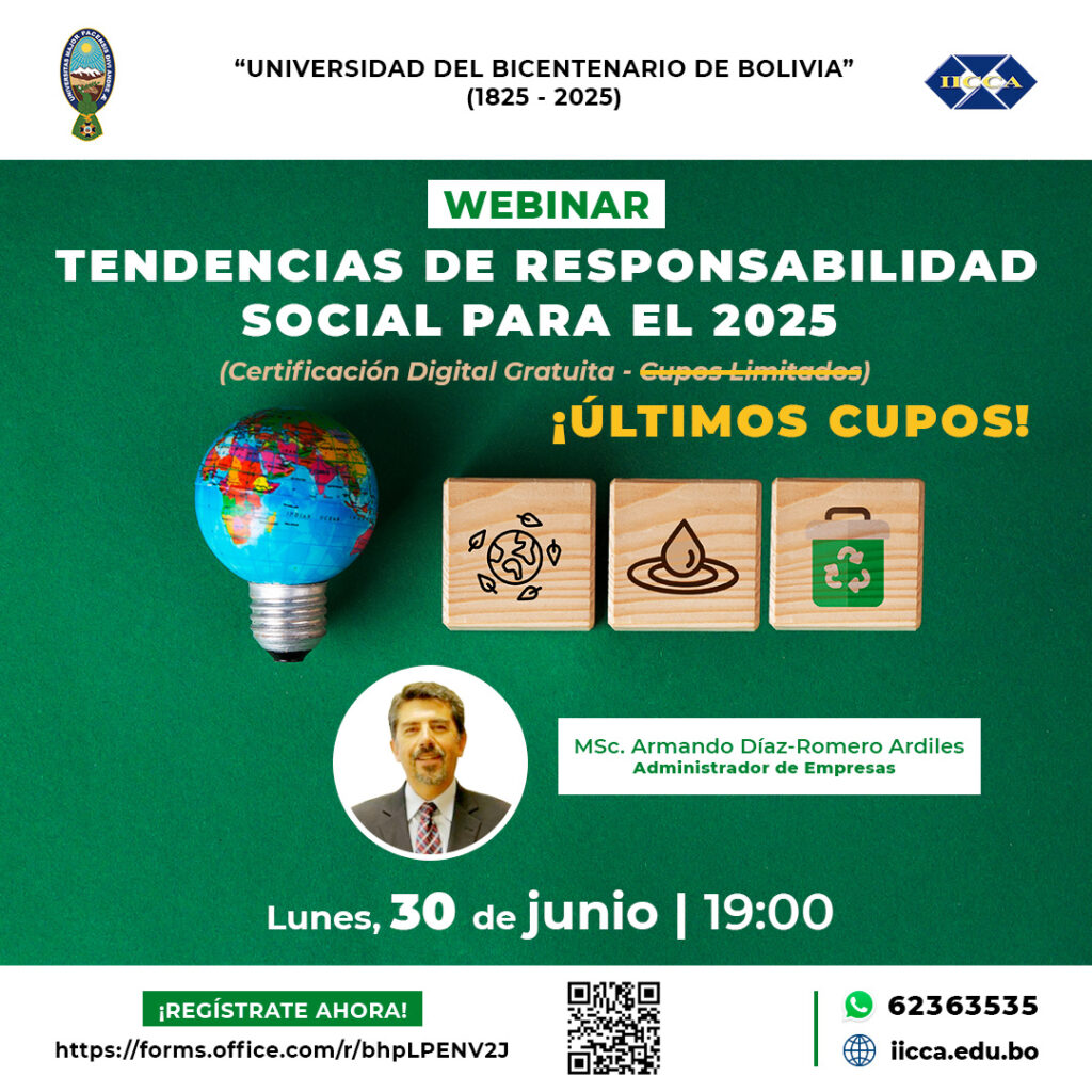 ¡ATENCIÓN! ÚLTIMOS CUPOS DISPONIBLES ¿Te interesa liderar con impacto y sostenibilidad? No te pierdas el webinar gratuito: TENDENCIAS DE RESPONSABILIDAD SOCIAL PARA EL 2025 Lunes, 30 de junio Hora: 19:00 Expositor: MSc. Armando Díaz-Romero Ardiles Certificación digital GRATUITA (cupos limitados...…
