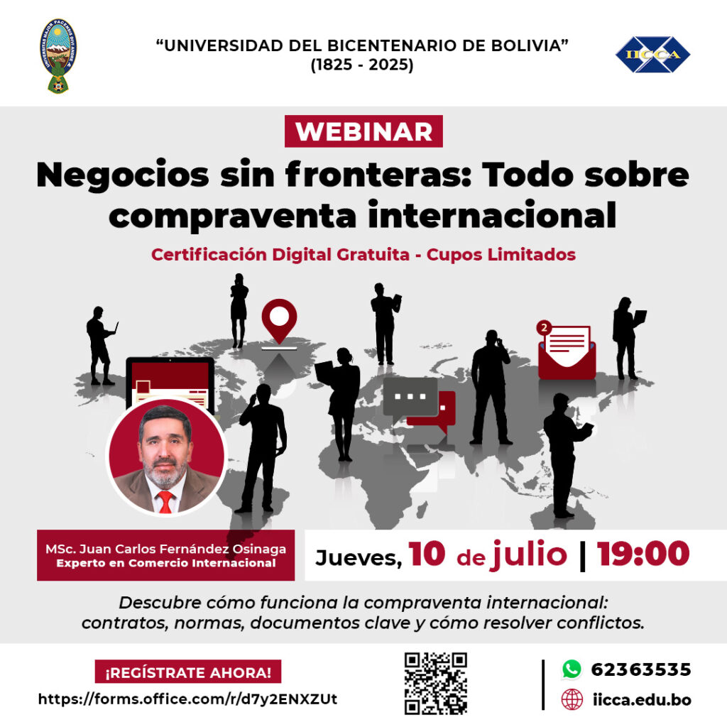 ¡Llega un evento imperdible para profesionales y emprendedores del comercio internacional! El IICCA te invita al WEBINAR GRATUITO: “Negocios sin fronteras: Todo sobre la compraventa internacional” Fecha: Jueves, 10 de julio. Hora: 19:00. Expositor: MSc. Juan Carlos Fernández Osinaga, experto…