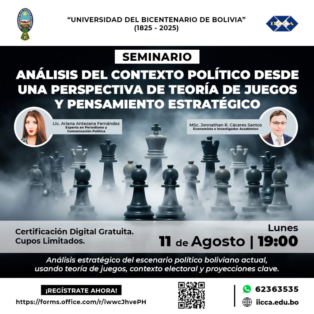 SEMINARIO GRATUITO | Certificación digital incluida ¿Quieres comprender mejor el escenario político boliviano actual? No te pierdas el seminario: “Análisis del contexto político desde una perspectiva de teoría de juegos y pensamiento estratégico” Con la participación de: Lic. Ariana Antezana…
