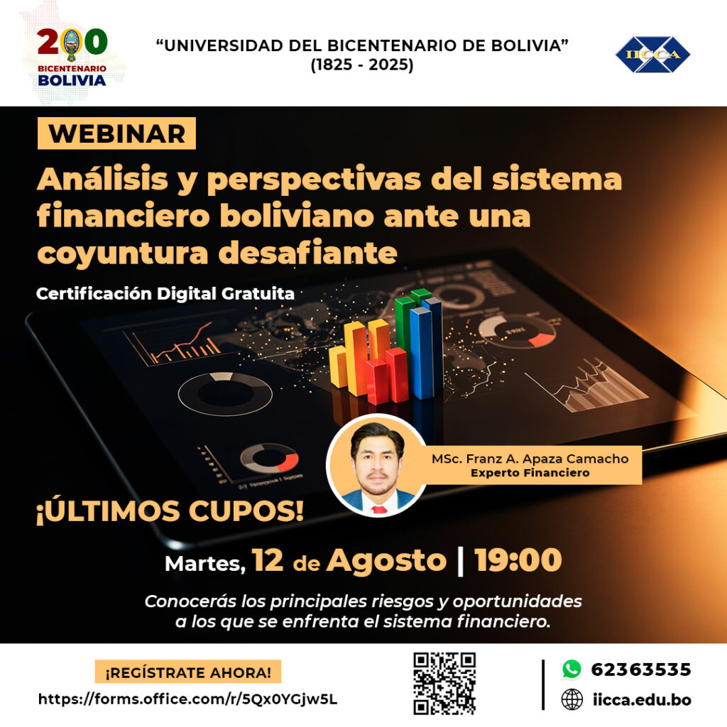 Gratuito¡Últimos cupos! Participa del webinar: “Análisis y perspectivas del sistema financiero boliviano ante una coyuntura desafiante” Fecha: Martes, 12 de agosto de 2025. Hora: 19:00. Modalidad: Virtual Certificación Digital Gratuita Expositor: MSc. Franz A. Apaza Camacho – Experto Financiero Conoce…