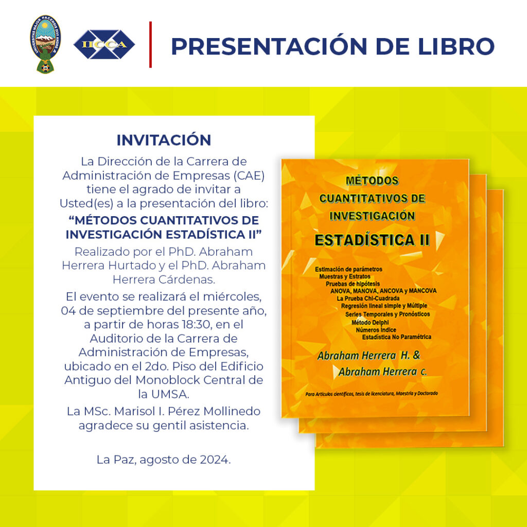 INVITACIÓN La Dirección de la Carrera de Administración de Empresas (CAE) tiene el agrado de invitar a Usted(es) a la presentación del libro: “MÉTODOS CUANTITATIVOS DE INVESTIGACIÓN ESTADÍSTICA II” Realizado por el PhD. Abraham Herrera Hurtado y el PhD. Abraham…