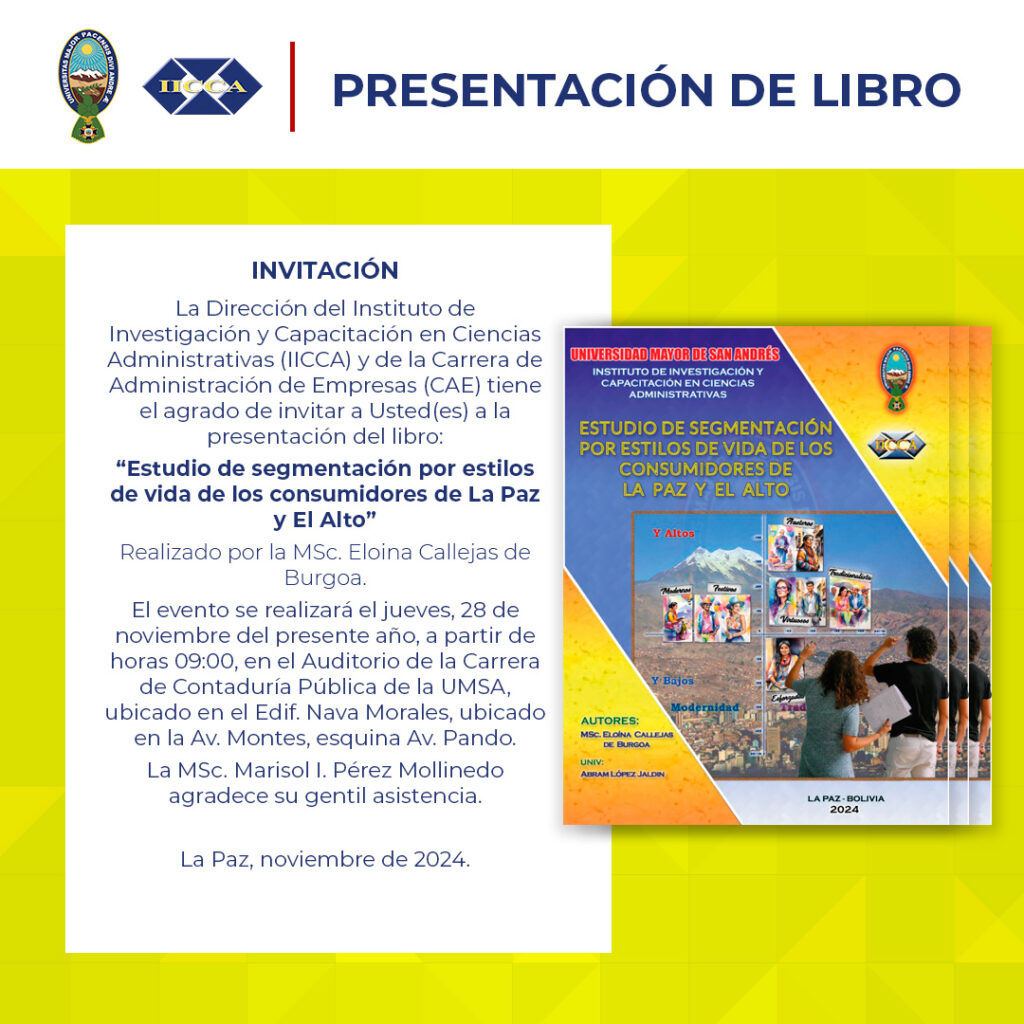 INVITACIÓN La Dirección del Instituto de Investigación y Capacitación en Ciencias Administrativas (IICCA) y la Carrera de Administración de Empresas (CAE) tienen el agrado de invitar a usted(es) a la presentación del libro: “Estudio de segmentación por estilos de vida…