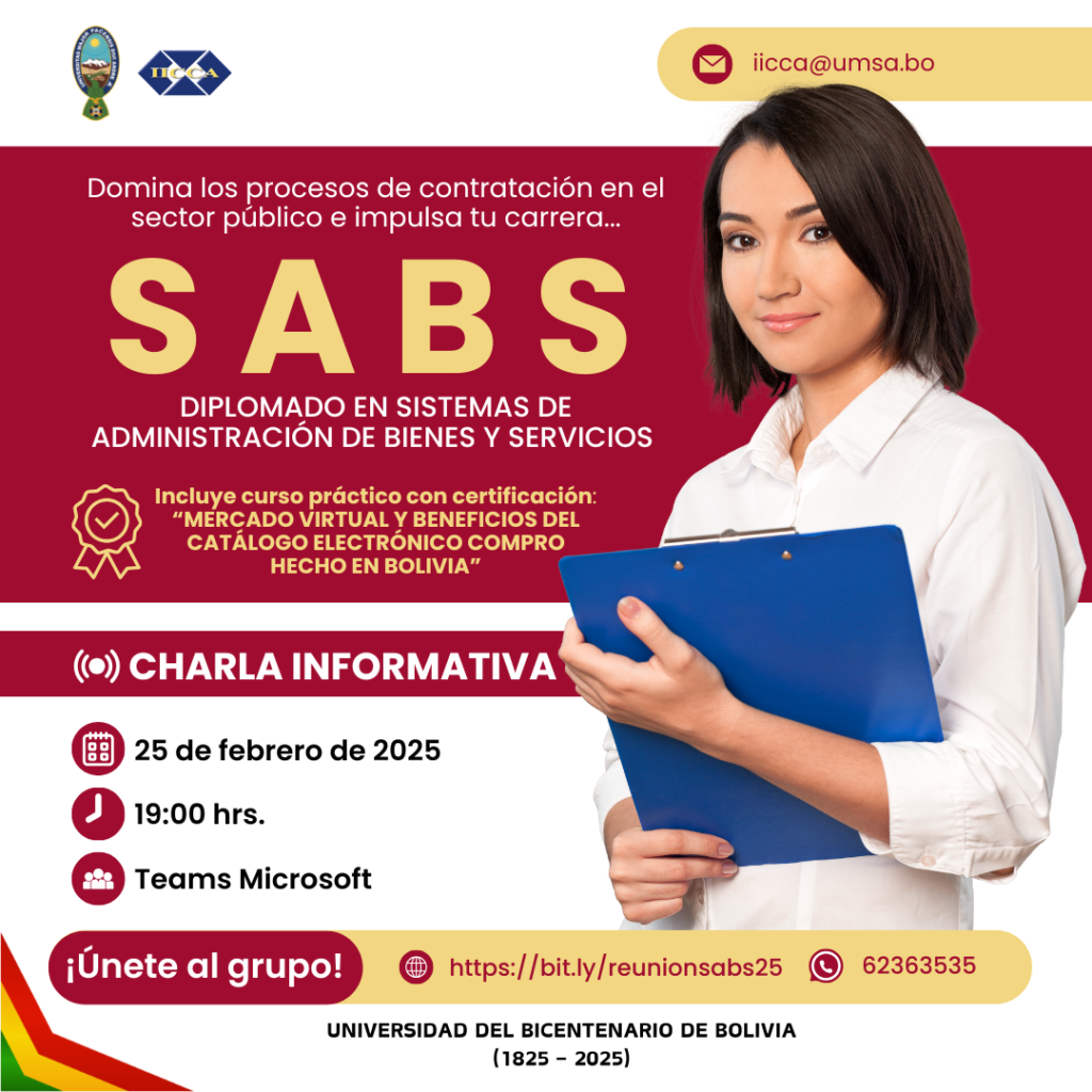 GratuitoDomina los procesos de contratación en el sector público e impulsa tu carrera... DIPLOMADO EN SISTEMAS DE ADMINISTRACIÓN DE BIENES Y SERVICIOS (SABS) Incluye curso práctico con certificación: “MERCADO VIRTUAL Y BENEFICIOS DEL CATÁLOGO ELECTRÓNICO COMPRO HECHO EN BOLIVIA” Fecha:…