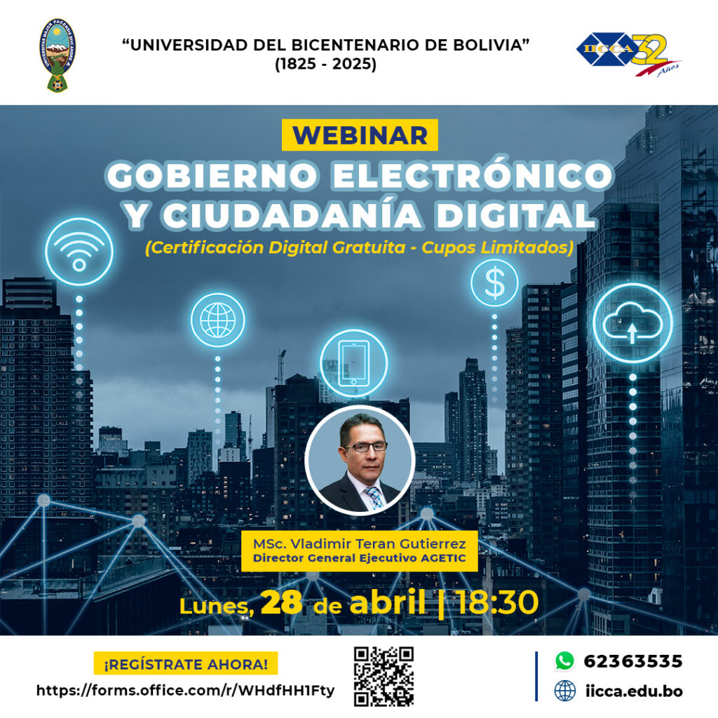 ¡No te pierdas esta oportunidad! Únete al Webinar Gratuito: "GOBIERNO ELECTRÓNICO Y CIUDADANÍA DIGITAL" Lunes, 28 de abril de 2025 | 18:30 hrs. Plataforma: TEAMS. Expositor: MSc. Vladimir Terán Gutiérrez Regístrate ahora: https://forms.office.com/r/WHdfHH1Fty