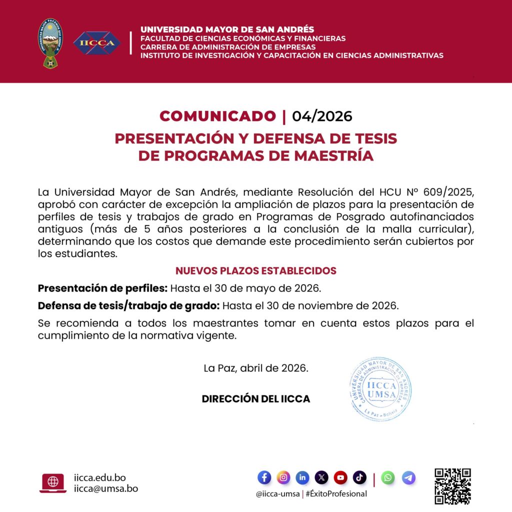 COMUNICADO 04/2026 | PRESENTACIÓN Y DEFENSA DE TESIS DE PROGRAMAS DE MAESTRÍA 13/04/2026 DESCARGARCompartir:
